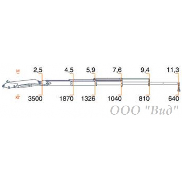 Максимальная грузоподъемность – 3500 кг Грузоподъемность при максимальном вылете стрелы – 640 кг / 11,3 м