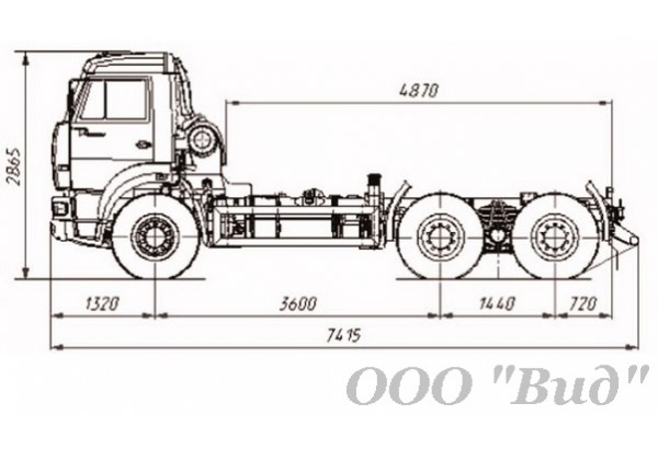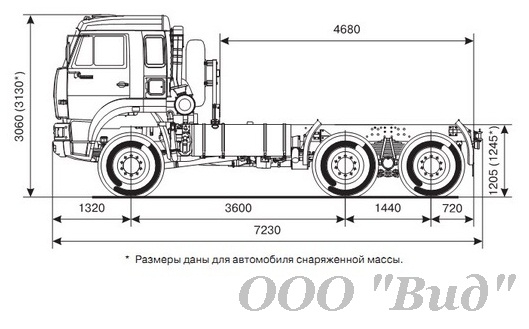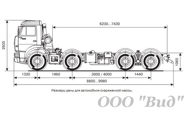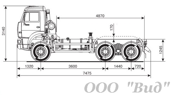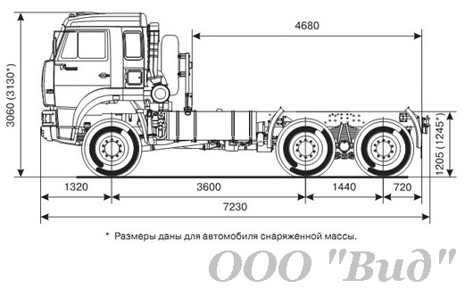 Шасси КАМАЗ 65225 Колесная формула — 6х6 Грузоподъёмность (нагрузка на седло), кг — 12100 (*23000) Допустимая полная масса а/м, кг — 22400 (*33300) Тип кабины — Длинная Двигатель — 740.63-400 Число передач КП — 16 База, мм — 3600 Длина, мм — 7230